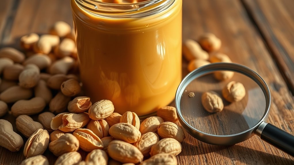 Aflatoxins, produced by the mold Aspergillus flavus, can contaminate peanuts, posing health risks when found in peanut butter. Contamination may occur during growth, processing, or storage, especially under poor conditions. To guarantee your safety, manufacturers rigorously test for aflatoxin levels, adhering to FDA regulations. While commercial brands often follow strict protocols, smaller brands may not. Understanding the safety measures in place can help you make informed choices about peanut butter. There’s more to explore on how to stay safe.