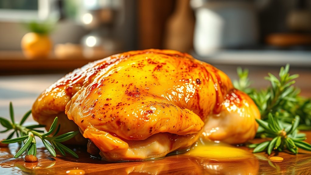 Basting with beurre monté turns chicken into a tender, flavorful delight you won’t be able to resist. This rich, buttery sauce infuses your dish with moisture and enhances natural flavors. Simply melt unsalted butter, mix in a splash of water, and use it to coat your chicken while it cooks. You’ll achieve a golden, crispy exterior while locking in juiciness. Ready to take your cooking to the next level? There’s more to discover about this technique!