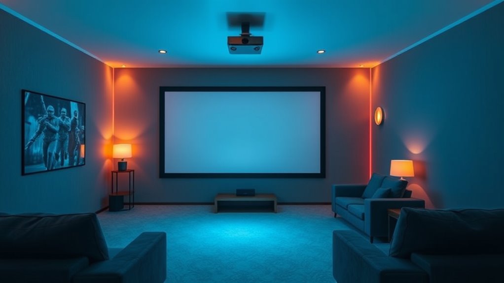 Choosing the right 4K projector for your home theater starts with understanding your room’s size and how it affects projection. You need to guarantee the projector’s maximum projection size matches your space, typically between 80 to 150 inches. Check the throw ratio to determine the distance needed between the projector and screen; ratios like 1.5-1.6 work well for medium to large rooms. Ambient light levels are vital—if your room is bright, a projector with at least 3,200 ANSI lumens will keep images clear. Also, consider available ceiling or table space for installation, including mounting options. Lens shift and keystone correction features help adjust for placement constraints, helping to ensure a properly aligned, rectangular image regardless of room limitations.