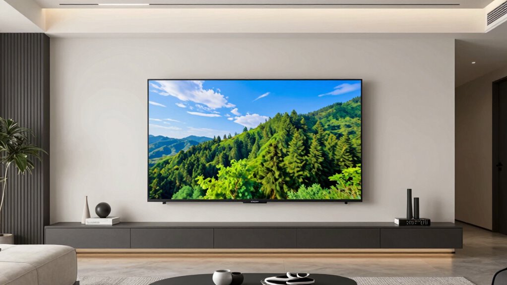 Choosing the right display technology is essential when selecting a 50-inch TV, as it directly affects picture quality, brightness, and color accuracy. LED TVs are affordable and energy-efficient but may lack contrast. QLED models use quantum dots to deliver brighter images and a broader color spectrum, enhancing vividness. OLED displays provide exceptional contrast and deeper blacks by turning off individual pixels, but they tend to be more expensive. Mini-LED technology improves local dimming, offering better contrast and precise brightness control compared to standard LEDs. Each option impacts your viewing experience differently, influencing not only picture quality but also energy consumption and cost. Understanding these technologies helps you pick a TV that balances performance and value, tailored to your specific viewing preferences.