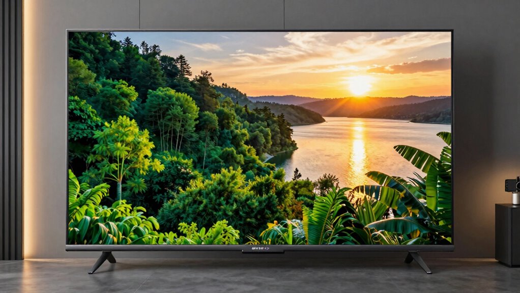 Picture quality features are the backbone of a great viewing experience, directly impacting how vivid, detailed, and smooth your content looks. I recommend looking for 4K resolution with HDR support, like Dolby Vision or HDR10+, to guarantee vibrant, lifelike images. OLED panels are ideal for deeper blacks and higher contrast ratios, giving scenes more depth. AI-powered upscaling can enhance non-4K content, making everything sharper and more detailed. A high refresh rate, at least 120Hz, is essential for smooth motion during fast-paced scenes, such as sports or gaming. Finally, pay attention to color accuracy and wide color gamut coverage, like Pantone validation, for rich, true-to-life colors. These features together create a stunning picture quality that elevates your viewing experience.