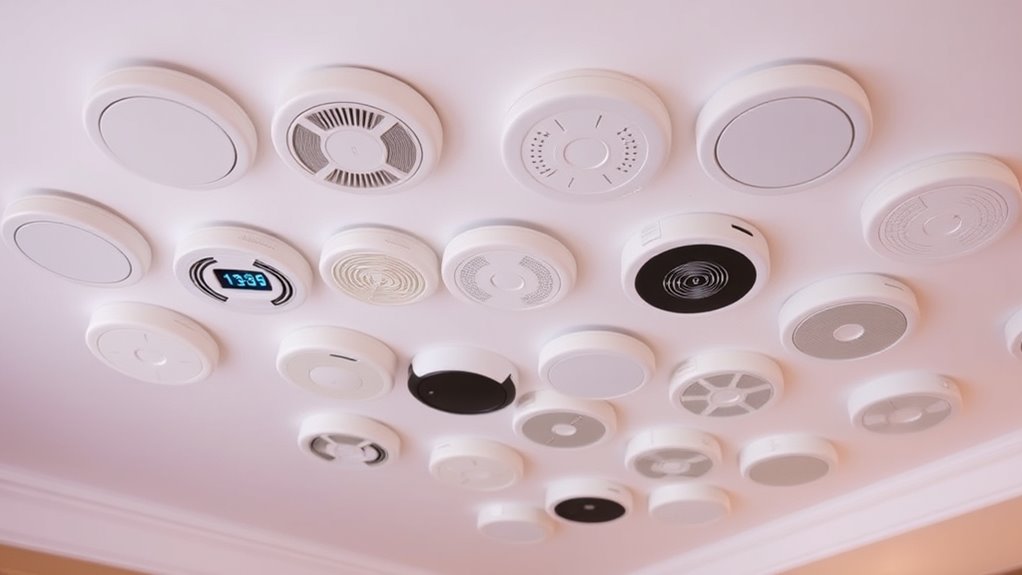 Choosing advanced smoke alarms with voice alerts hinges on the accuracy of their detection technology. I look for alarms equipped with photoelectric and electrochemical sensors, which effectively differentiate between real fires and false alarms caused by cooking, steam, or dust. Modern alarms often feature Precision Detection sensors that meet industry standards, reducing nuisance alerts and providing reliable early warnings. Dual sensors for smoke and carbon monoxide improve accuracy by detecting multiple hazards simultaneously. Proper placement and calibration are essential to maintain sensor precision and avoid false positives. Continuous advancements, including AI and pattern recognition, are further enhancing detection reliability. Overall, high-quality detection technology guarantees I get timely alerts without unnecessary interruptions, keeping my home safe and sound.