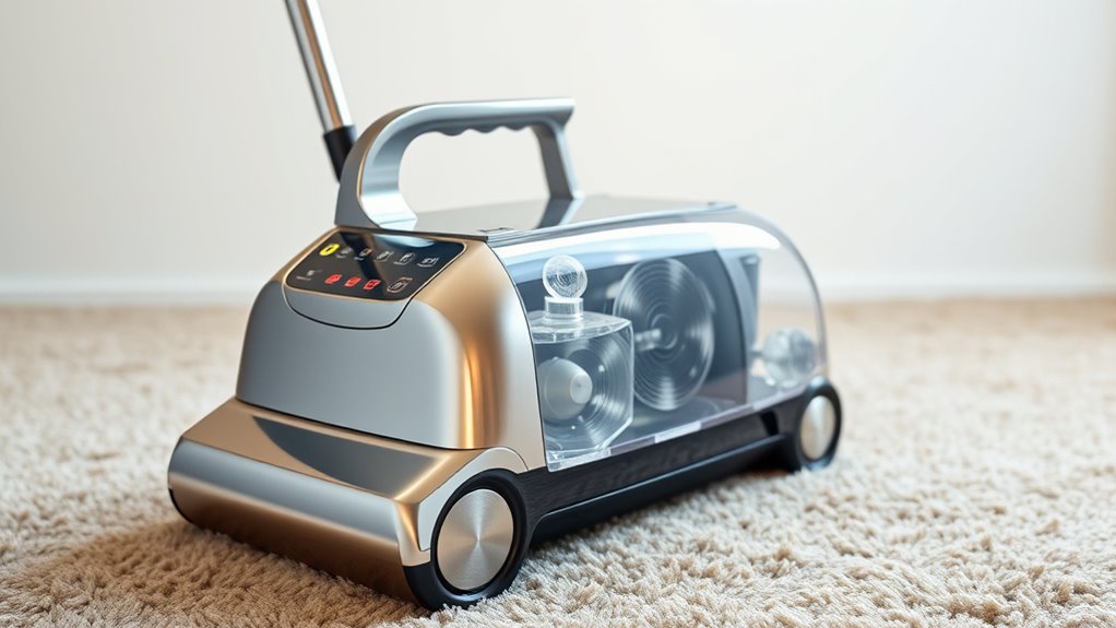 Choosing an all-in-one carpet cleaner with strong cleaning power means paying close attention to its suction strength, brush system, and ability to tackle embedded dirt, stains, and pet hair. A powerful suction motor is vital for lifting deep-seated dirt, while multiple spinning brushes enhance agitation and dirt removal. High-pressure spray systems help loosen stubborn stains, making extraction more effective. Machines with dual suction paths improve drying times and overall cleaning results. The quality of cleaning solutions also matters; effective formulas can target tough stains and odors. Regular maintenance—like cleaning filters and ensuring brushes are in good condition—keeps performance at its best. Overall, a machine with a combination of these features guarantees deep cleaning, leaving your carpets spotless and fresh.
