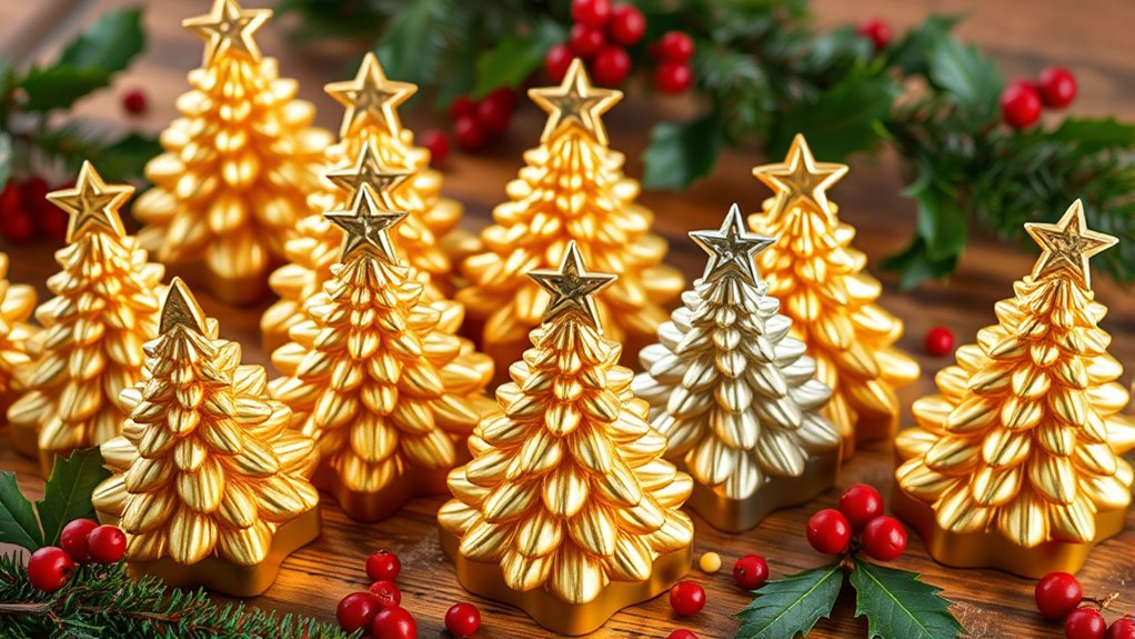 Imagine gently releasing a perfectly shaped Christmas tree from its mold, like unfolding a delicate ornament. To prevent sticking, I always grease my mold with butter or non-stick spray generously, ensuring every crevice is coated. I then chill the mold briefly in the fridge before removal. When I gently flex or tap the mold, the butter or spray works like magic, helping my creation slide out smoothly, pristine and ready to impress.