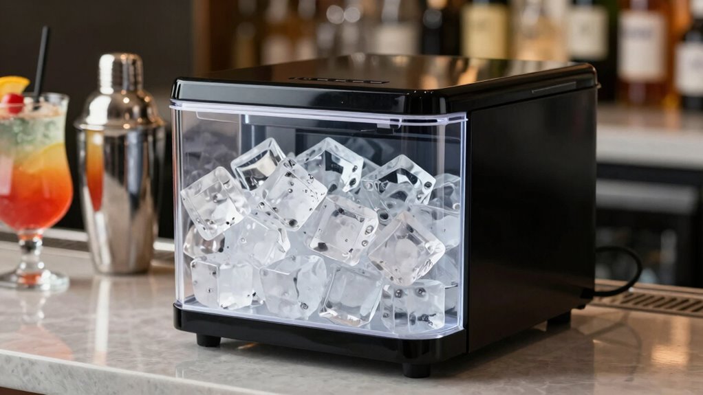 Like a well-trained barista, these ice makers are surprisingly energy-efficient. They use modern compressors and smart insulation, which help lower power consumption while still producing crystal-clear ice quickly. I’ve found that many models are Energy Star certified, meaning they meet strict efficiency standards. So, if you’re mindful of energy use but crave perfect cocktails, these machines strike a great balance, saving you money and reducing environmental impact.