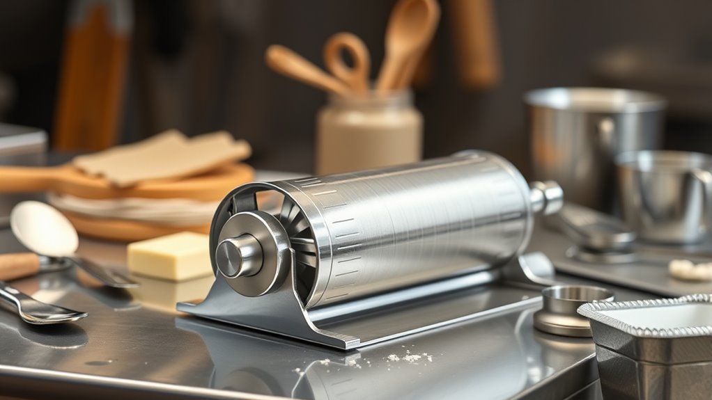 Ease of cleaning is a crucial factor when evaluating a commercial butter wheel roller, as it directly impacts maintenance time and hygiene. I look for models with removable or detachable wheels, making it simple to clean butter residue thoroughly and prevent buildup. Dishwasher-safe components are a huge plus, allowing me to sanitize parts quickly after each use without hassle. The material matters too—stainless steel resists rust and corrosion, which keeps cleaning easier and maintains high hygiene standards. An ergonomic design with minimal crevices and hard-to-reach spots reduces bacteria risk and cross-contamination. Regular maintenance, including brushes or wipe-downs, helps preserve the roller’s performance and lifespan. Choosing a model with these features simplifies cleaning routines and ensures consistent, sanitary results in my baking process.