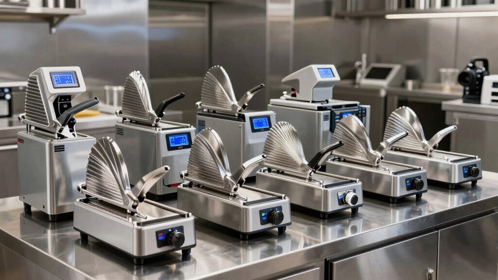 Are you aware of how the price and warranty options can influence your decision when selecting a commercial cheese slicer? Prices vary widely depending on features, size, and durability, from budget-friendly models to premium options. While a lower price might seem appealing, it’s vital to take into account the warranty coverage. Longer warranties—ranging from six months to several years—often signal higher confidence in the product’s durability and can offer better long-term value. Some machines include extra benefits like free blade replacements or maintenance, reducing ongoing costs. Comparing the warranty details alongside the price helps you assess overall reliability and worth. Ultimately, a balance between affordability and extensive warranty coverage ensures you choose a slicer that’s both cost-effective and dependable for your needs.