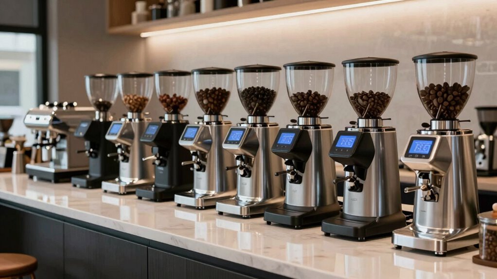 If you’re looking for the 15 best commercial coffee grinders for home baristas in 2026, I’ve found top choices that balance precision, durability, and speed. These grinders offer adjustable settings, consistent grind sizes, and user-friendly controls suited for serious coffee enthusiasts. Whether you need a compact model or commercial-grade performance, there’s something for every space and brewing style. Keep exploring to discover detailed options and tips to choose the perfect grinder for your home setup.