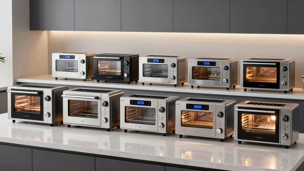 These models come equipped with essential safety features like automatic shut-off, which activates if the oven overheats or runs too long. They also have cool-touch exteriors to prevent burns and non-slip feet for stability. Some models include safety alarms or indicator lights to alert you when the oven is in use or if there’s a malfunction. I always look for these features to guarantee safe, worry-free operation in my kitchen.