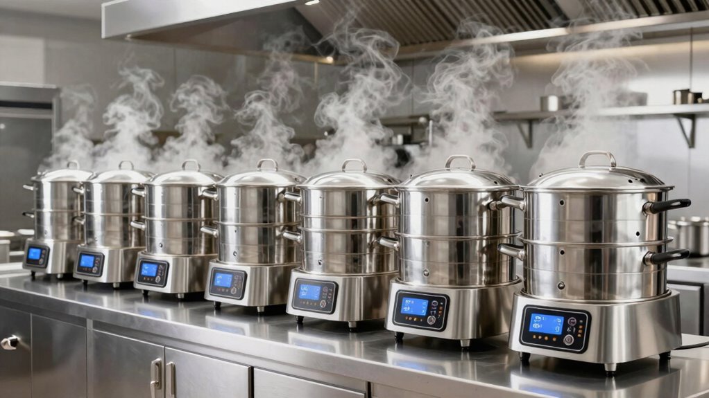 Heating efficiency in a commercial countertop steamer hinges on its power wattage, with higher wattages delivering faster, more uniform heat. This means that a more powerful steamer heats up quickly and maintains consistent temperatures, reducing cooking times and improving food quality. The design of the heating element also plays a vital role; systems like U-shaped or direct contact elements distribute heat more evenly. Good insulation, such as heat-resistant polyurethane foam, minimizes heat loss and conserves energy during operation. Additionally, an effective circulation system, like internal thermal circulation, ensures even heat distribution across all trays, preventing cold spots. Rapid steam production—sometimes within seconds—is another key indicator of a steamer’s efficiency, helping to streamline kitchen workflows and deliver consistent results.