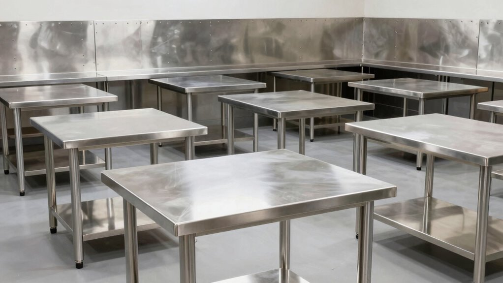 Think of these tables like a well-armored knight—built to withstand the relentless battles of a busy kitchen. Yes, they’re resistant to corrosion and rust over time, thanks to their high-quality stainless steel. I’ve found that with proper cleaning and maintenance, they keep their shine and strength, standing tall against moisture and acids. So, you can count on them to stay durable and reliable, no matter how hectic the work gets.