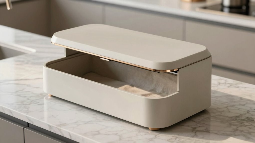 Since your kitchen’s style sets the tone for the entire space, selecting a bread box that complements your existing decor is essential. I recommend choosing a design and color that match your overall theme, whether farmhouse, modern, or vintage. Materials like bamboo, stainless steel, or glass can enhance your countertops and cabinetry, creating a cohesive look. Consider the shape and size of the bread box to ensure it fits comfortably on your counter without crowding other items. Aesthetic details like acrylic windows, frosted panels, or decorative handles add visual appeal and personality. In conclusion, try to match the bread box with other kitchen accessories for a unified, harmonious style that elevates your space.