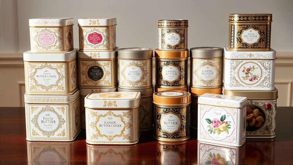 When considering the perfect Danish butter cookie gift tin, reusability and storage capabilities play a key role in making a smart choice. I look for tins made from durable metals or sturdy plastics, so I can reuse them for years. An airtight seal is essential to keep cookies fresh and preserve flavor. Decorative tins not only store cookies but can double as attractive containers for small household items, adding value. The size and shape matter too—whether I need stacking options or a fit for my pantry shelves. Eco-friendly and recyclable options are increasingly important, allowing me to enjoy the gift while minimizing environmental impact. Overall, a versatile, well-designed tin enhances both the gifting experience and practical storage.