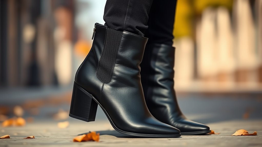 Choosing designer ankle boots that are easy to wear can substantially enhance your fall wardrobe. Boots with side zippers or slip-on designs are much simpler to put on and take off than styles with only laces or pull-on features. External zippers often provide faster access, making dressing quicker. Chelsea boots with elastic sides or stretch panels are especially convenient, offering a snug fit without fuss. Additionally, opting for boots with a low or moderate heel height simplifies dressing and reduces foot strain, making them more practical for daily wear. Properly designed ankle boots with wide openings or adjustable features also help accommodate various foot shapes and mobility needs. Prioritizing ease of wear guarantees comfort without sacrificing style, making your fall footwear both fashionable and functional.