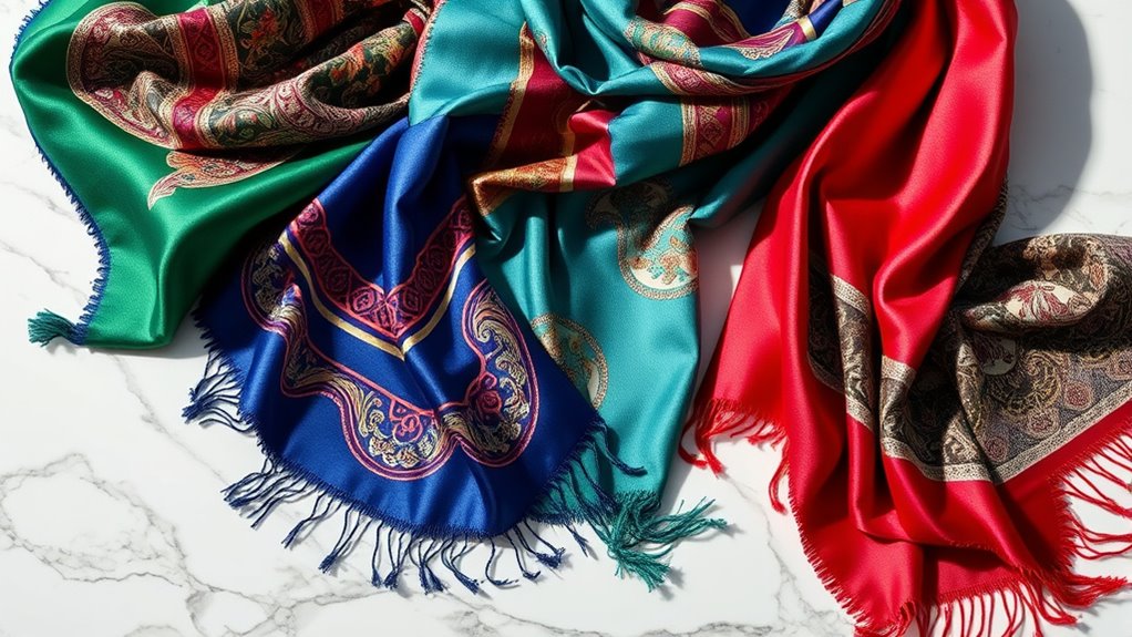 How do you guarantee you’re getting the best value when shopping for designer scarves and wraps? Setting a clear budget is key—it helps narrow your options and keeps overspending at bay. Prices can vary widely, from about $20 for faux silk styles to over $200 for genuine high-end silk or luxury brands. To find the best deal, compare prices across different retailers and online marketplaces. Also, consider the cost-benefit ratio: a higher price might be justified if the material quality, brand reputation, and design are superior. Keep an eye out for sales, discounts, and seasonal promotions to make designer scarves more affordable. Being strategic about pricing ensures you invest wisely while elevating your style without breaking the bank.