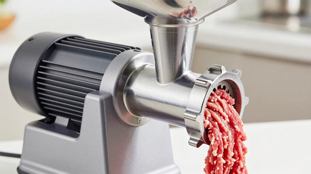 A durable build sets the foundation for a reliable heavy-duty electric meat grinder, but safety features are equally important to guarantee smooth and risk-free operation. Overload protection prevents motor burnout during heavy use, keeping the grinder running smoothly. A reverse function is essential for clearing jams safely without risking injury or damage. Safety circuit breakers protect against electrical surges, reducing the risk of fires or shocks. Non-slip bases or locking mechanisms ensure the grinder stays stable, minimizing accidents during operation. Overheat protection automatically shuts off the motor when it reaches a safe temperature, allowing for long-term, safe use. Together, these safety features not only enhance user safety but also prolong the lifespan and reliability of your meat grinder.