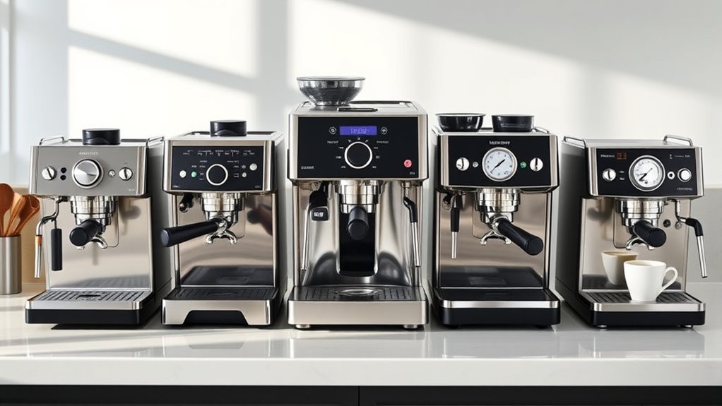 Choosing an espresso machine that’s easy to operate can make all the difference for beginners. I look for models with intuitive controls and clear instructions, so I can confidently brew without guesswork. Machines with automatic features, like one-touch brewing or auto-frothing, simplify the process and save time. Clear indicators such as pressure gauges and water level displays help me monitor the brewing process, making certain I don’t over- or under-extract. User-friendly machines often come with step-by-step guides or preset modes, which mean less manual adjustments and more consistent results. Being able to customize basic settings without steering through complex menus is a big plus, letting me fine-tune my shots with minimal effort. Overall, ease of use ensures I enjoy my espresso journey without frustration or steep learning curves.