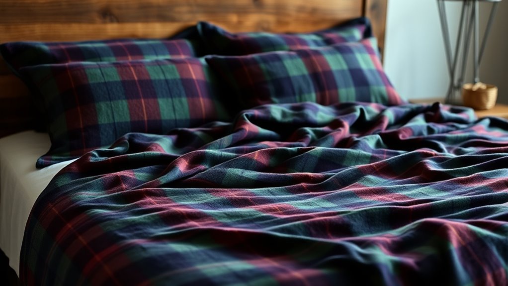 Caring for flannel sheets is like tending to a cherished book—gentle handling keeps them cozy. I wash mine in cold water on a gentle cycle, avoiding fabric softeners that can dull the fabric’s softness. I tumble dry on low or hang dry to prevent pilling. Regular care preserves their warmth and softness, so I wake up feeling snuggly every morning. Your sheets will thank you with lasting comfort.