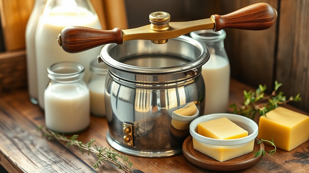 Safety features on hand-crank cream separators are like a shield protecting users. Most come with a manual lock to prevent accidental spinning, a sturdy lid to keep splashes contained, and non-slip feet for stability. Some models also include safety interlocks that stop the device if parts aren’t assembled correctly. These features guarantee safe, worry-free dairy processing, giving you peace of mind while working efficiently.