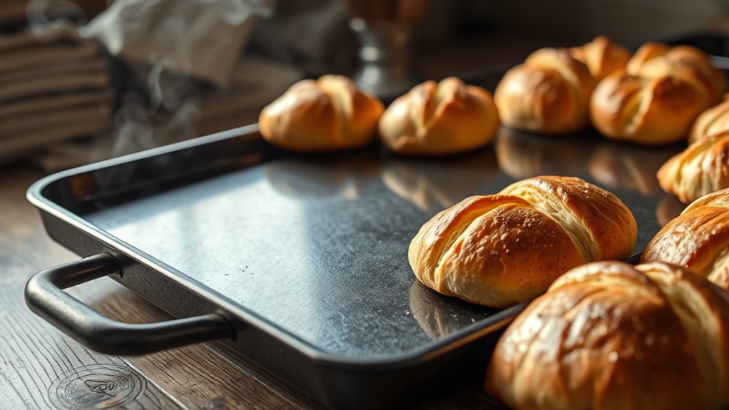Selecting a heavy baking steel with high thermal conductivity guarantees your butter pastries bake evenly and develop the perfect flaky layers. Steel with higher thermal conductivity, like carbon steel, transfers heat more quickly and uniformly to your dough, ensuring consistent results. Thinner steels typically conduct heat faster, giving you that rapid heat transfer needed for flaky layers, though they may be less durable. The material composition also matters—carbon or aluminum alloys boost heat conduction, making the steel more responsive during baking. Proper preheating enhances this process, allowing the steel to reach high temperatures swiftly and evenly. This efficient heat transfer is essential for creating those crisp exteriors and tender, layered interiors in pastries like croissants and puff pastry. Overall, heat conductivity is key to professional-quality results.