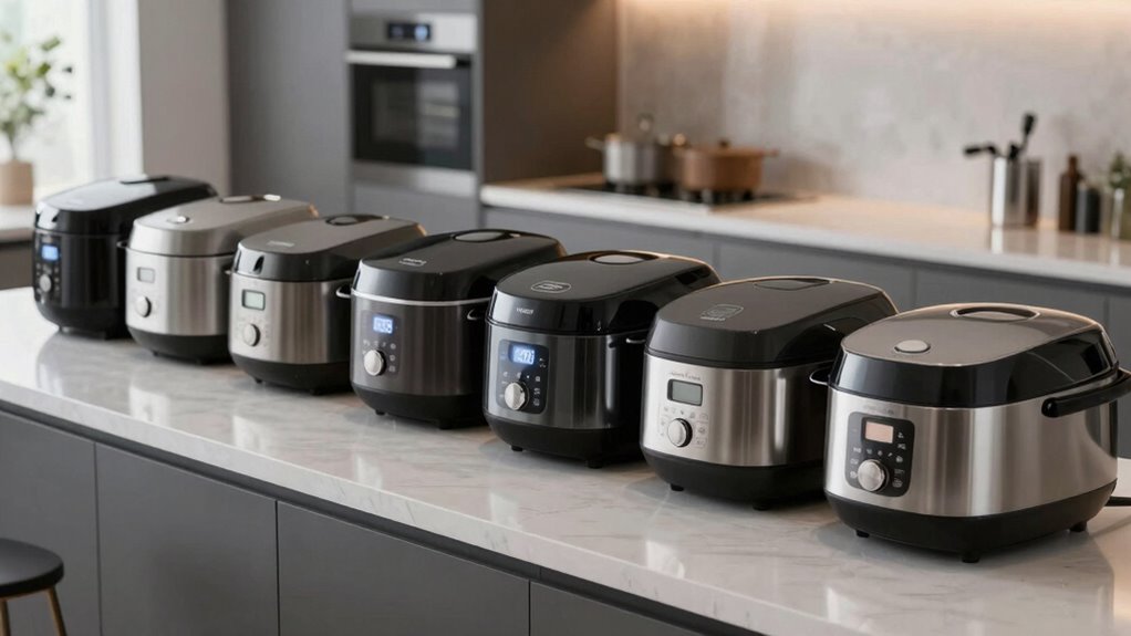 Choosing the right capacity and size for your rice cooker guarantees it fits your needs and kitchen space. High-end models typically range from 3 to 12 cups of uncooked rice, making them suitable for singles, couples, or large families. Smaller models, like 3 to 6 cups, are perfect if you cook for one or two people, offering portability and saving counter space. Larger capacities are ideal for hosting gatherings or meal prepping but require more storage room and often include features to handle bigger volumes efficiently. It’s important to match the cooker’s size to your usual cooking quantities to avoid waste or the hassle of frequent refills. Also, consider your kitchen setup to ensure the cooker fits comfortably without cluttering your workspace.