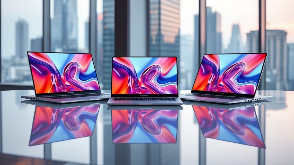 Choosing a high-end 2-in-1 laptop means prioritizing performance power, which depends heavily on the processor, RAM, storage, and graphics capabilities. For processors, look for Intel Core i7 or AMD Ryzen 7/9 chips—they deliver smooth multitasking and handle demanding tasks with ease. Ample RAM, ideally 16GB or more, guarantees seamless switching between multiple applications without lag. Fast storage, such as NVMe SSDs with 512GB or higher capacity, provides quick boot times and rapid data access, boosting overall responsiveness. Graphics performance is also essential; options like Intel Iris Xe, AMD Radeon, or Intel ARC support creative work, gaming, and visual workflows. Some premium models include AI and neural processing units, further enhancing machine learning and system efficiency for a truly powerful experience.