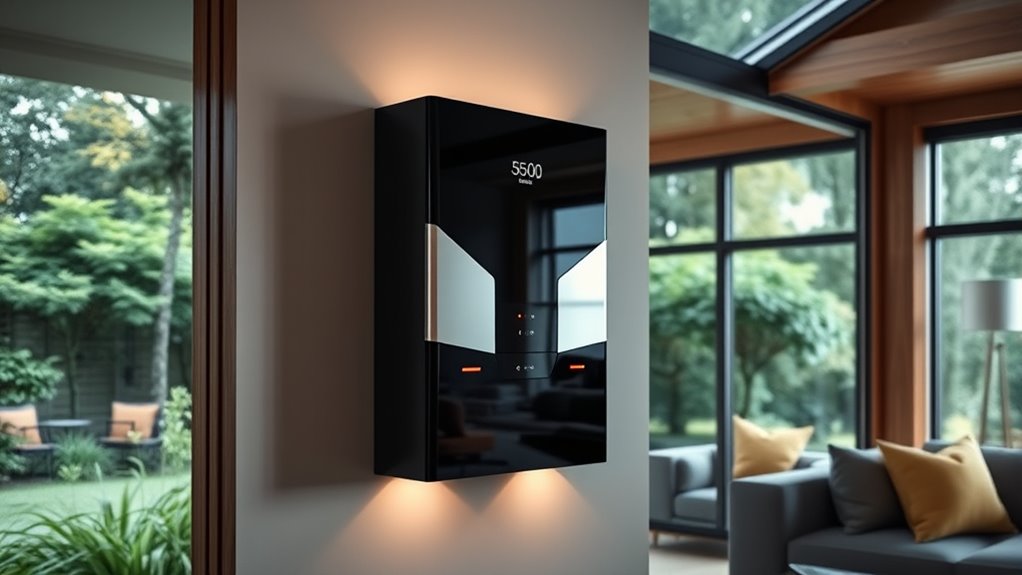 Ensuring safety and proper certification is vital when selecting a high-end home battery backup system. I always check that the system is certified by recognized safety organizations like UL, CE, or FCC, confirming it meets industry standards. It’s essential the system includes safety features such as automatic shutoff, overcharge protection, and thermal regulation to prevent hazards. I also verify that the battery chemistry, like Lithium Iron Phosphate (LiFePO4), complies with safety standards for thermal stability and abuse resistance. Additionally, I look for certifications related to fire safety, electrical safety, and electromagnetic compatibility to guarantee thorough safety. Reviewing manufacturer documentation, including test reports and compliance certificates, provides extra confidence that the system is safe, reliable, and built to meet rigorous safety requirements.