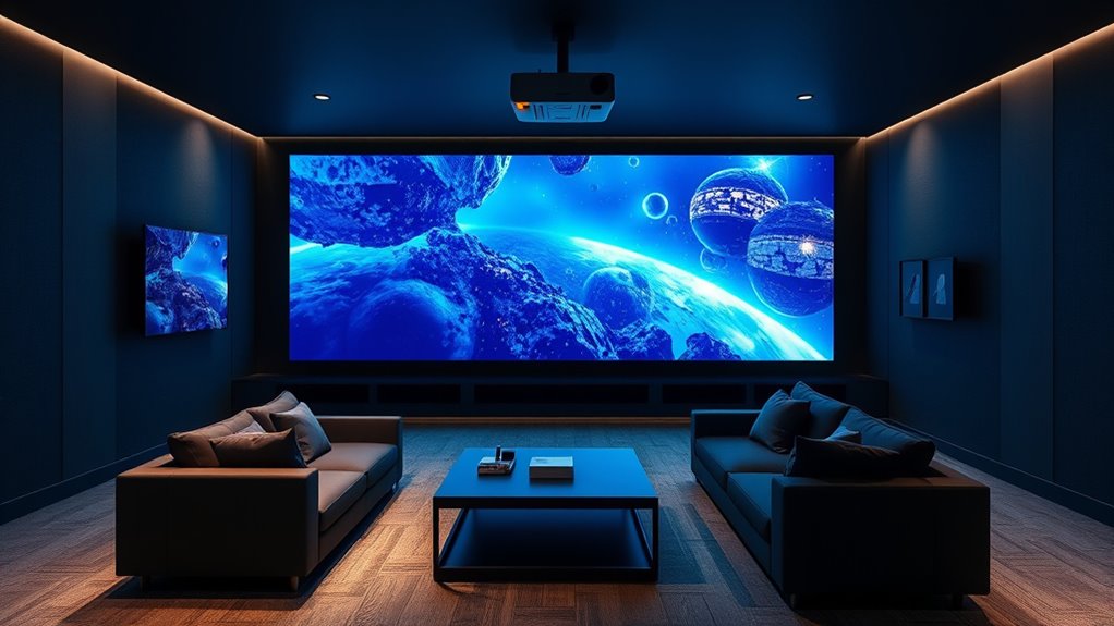 Think of your screen as the window to a vivid universe. Screen size and throw distance are essential—they shape your cinematic journey. Larger screens draw you in like a magnet, immersing you fully, while the right throw distance guarantees clarity without distortion. I believe balancing these elements creates a seamless escape, making your home theater feel like stepping into a real movie set, transforming ordinary nights into extraordinary experiences.