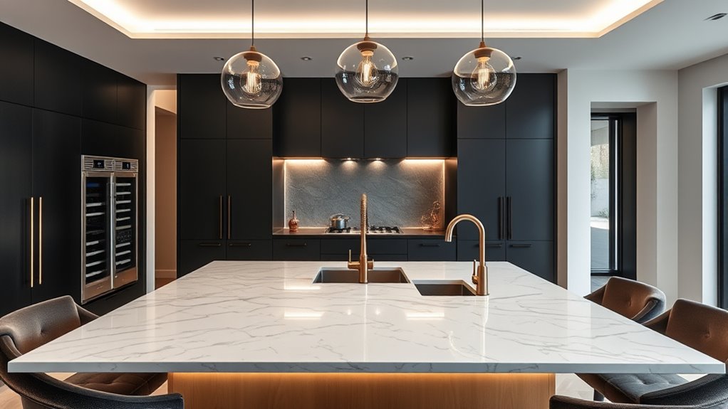 High-end islands boost my kitchen workflow by offering designated spaces for prep, cooking, and clean-up, making everything more organized. I love how built-in features like wine coolers, ample storage, and multiple outlets keep my tools and ingredients within reach, reducing clutter. The spacious surfaces allow me to work comfortably, while sleek designs inspire efficiency and elegance. Overall, a luxury island transforms my kitchen into a more functional and enjoyable space.