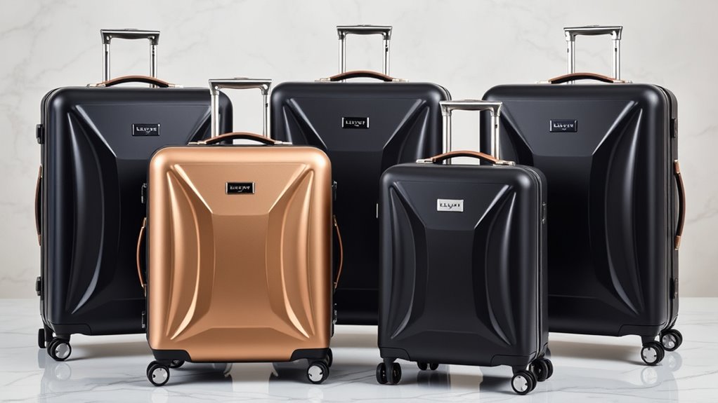 High-end travel luggage sets prioritize security features that protect your belongings without adding unnecessary bulk. Many include TSA-approved locks, allowing security personnel to inspect your luggage without damage or forced entry. Double-layered YKK zippers enhance security by resisting tampering and accidental splitting, ensuring durability and peace of mind. Integrated combination locks provide customizable security, making it easy to set and remember your code. Side-mounted TSA locks allow security checks without opening the suitcase, preserving privacy and maintaining the integrity of your belongings. Some luxury sets even feature advanced locking mechanisms that combine electronic access with physical locks, offering an extra layer of protection. These features help guarantee your luggage stays secure throughout your travels, giving you confidence in your high-end investment.