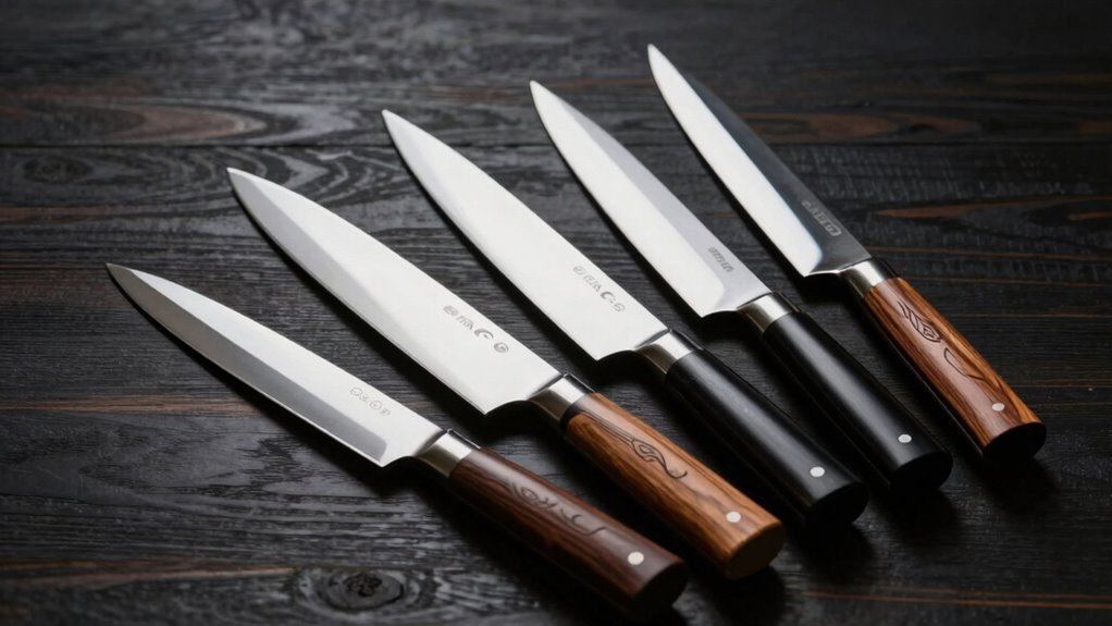 A well-designed handle is essential for comfort and control during extended use, as it reduces hand fatigue and guarantees precise maneuvering. An ergonomic handle fits naturally into your hand’s shape, making prolonged chopping or slicing less tiring. A secure grip is pivotal, especially when working with wet or greasy ingredients, to prevent slips and ensure safety. Handles with textured or non-slip surfaces like Pakkawood or G10 offer better control and lower accident risk. The handle’s shape, whether D-shaped or octagonal, influences maneuverability and comfort for both left- and right-handed users. Proper handle design also balances weight distribution, reducing wrist strain and enhancing precision. Ultimately, a handle that feels comfortable and secure improves your overall control and confidence in the kitchen.