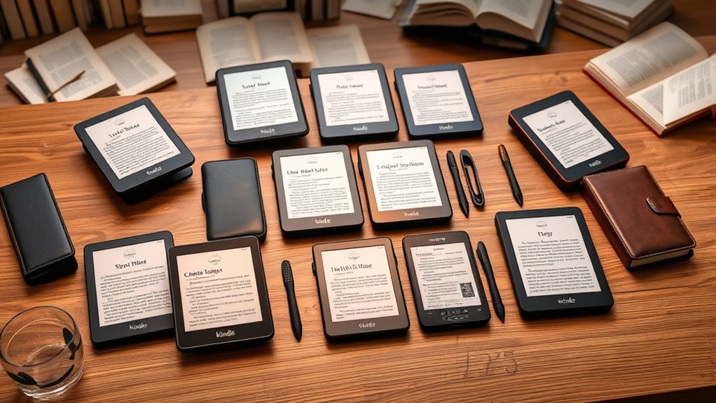 If you’re exploring the 15 best Kindle e‑readers for 2025, I recommend considering models with high-contrast, glare-free displays, waterproof design, ample storage, and lightweight portability. Devices like the Kindle Paperwhite Signature Edition, Scribe, and the Colorsoft Signature Edition stand out for their features like adjustable warm lighting, large screens, and sturdy builds. To find the perfect fit for your preferences, keep an eye on details like screen size, battery life, and extra functionalities—if you keep reading, you’ll discover which one suits you best.
