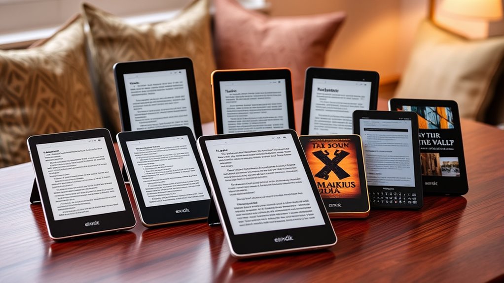 Imagine my e-reader as a trusty lantern on a dark trail—its battery life determines how far I can go before recharge. Alternatives like Kobo or Nook often offer comparable or even longer battery life than Kindle Oasis, sometimes lasting weeks. Charging options vary too; some devices support USB-C for quick power-ups, while others rely on micro USB. Overall, these options give me flexibility and peace of mind during long reading adventures.
