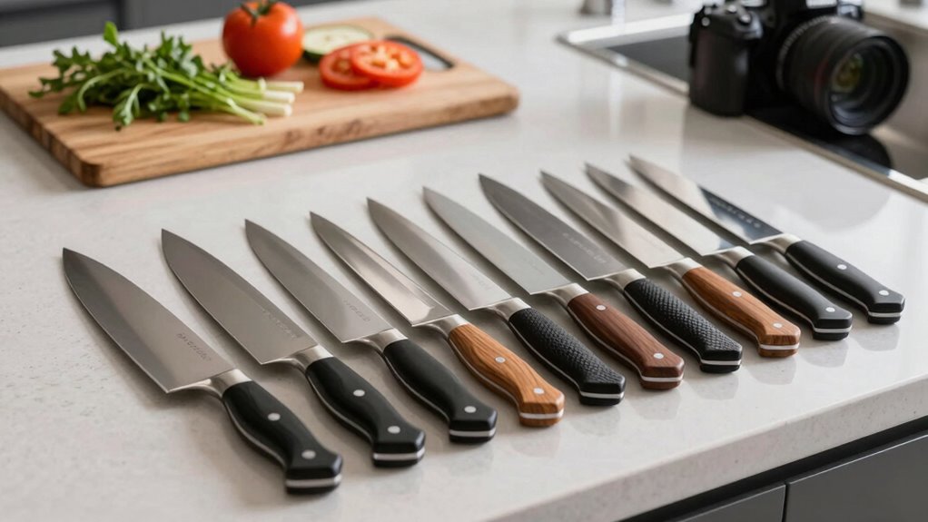 Ever wonder what safety features make an affordable knife more secure? I look for knives with a non-slip grip, as it helps maintain control even when my hands are wet. A full tang adds strength and balance, reducing the risk of breakage. Rounded spine edges prevent accidental cuts during handling. Do you prioritize safety as much as sharpness? Choosing knives with these features guarantees I can cook confidently and safely.