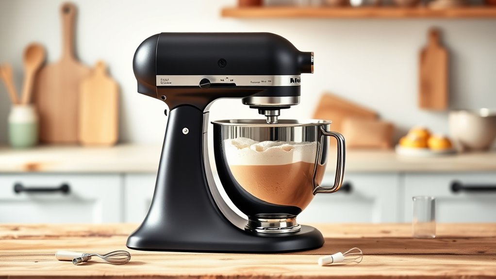 If you’re looking to elevate your baking game in 2025, I’ve got the inside scoop on the top luxury stand mixers. These models offer powerful motors, large capacity bowls, sleek designs, and versatile attachments perfect for all your baking needs. Brands like KitchenAid, Aucma, and COOKLEE combine performance with style, ensuring durability and aesthetic appeal. Want to discover which mixer suits your kitchen best? Keep exploring for detailed insights that will help you choose the perfect fit.
