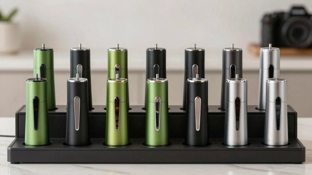 When selecting an electric matcha whisk machine, considering its design and portability is essential for convenience and ease of use. I look for a compact, lightweight model that’s easy to handle and carry, especially if I travel often. A built-in stand or storage case helps keep the device organized and protected when not in use. Wireless or battery-powered options are a plus, as they eliminate cords and allow more freedom of movement. An ergonomic grip and intuitive interface make operation comfortable, even during extended use. Durability is also key—materials like stainless steel ensure the whisk resists rust and withstands frequent use. Overall, a thoughtfully designed, portable machine enhances my brewing experience by combining practicality with functionality.