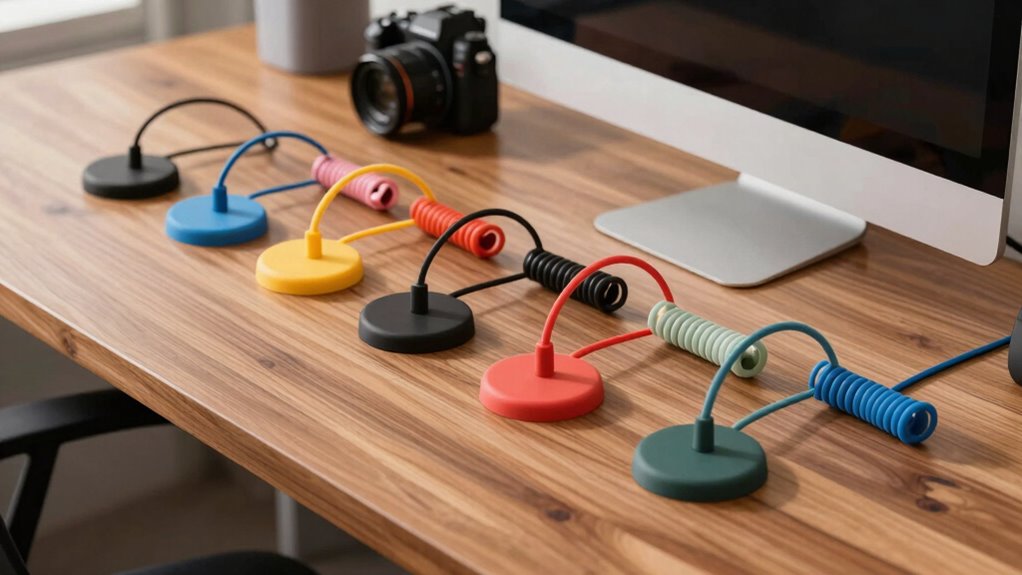 If you’re looking to keep your desk tidy and guarantee smooth mouse movements, I recommend checking out the top seven mouse bungees like the ENDGAME GEAR MB1, Hotline Games Bungee 3.0, Razer V3 Chroma, and others. These options offer stability, customizable tension, RGB lighting, and versatility for different cables. Each one is designed to improve control and reduce clutter, making your setup neater and more efficient. Stick around to explore which of these fits best for your needs.