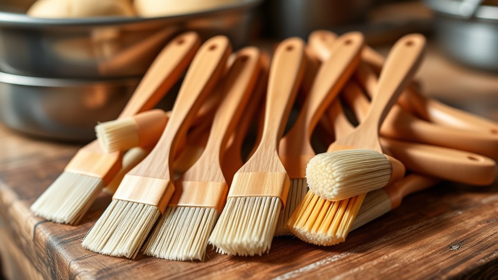 Choosing a natural-bristle butter brush becomes easier when you consider how simple it is to clean and maintain. These brushes can usually be rinsed thoroughly with warm water and mild soap, making cleanup quick and hassle-free. To keep them in top shape, always dry the brush completely after washing to prevent mold, mildew, or bacteria from forming. Many natural-bristle brushes feature water-resistant handles and bristles, which help them dry faster and reduce residue buildup. Regular cleaning and proper storage—like hanging the brush by its handle—can markedly extend its lifespan and ensure hygiene. Just remember, avoid soaking the brush for long periods, as prolonged immersion can damage the bristles or wood handle, compromising both cleaning ease and durability.