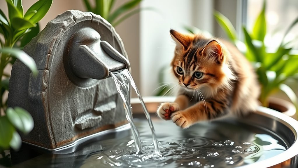 Opting for a fountain with multiple water flow options can markedly encourage your cat to drink more by mimicking natural water sources they’re instinctively drawn to. Features like waterfall, stream, or gentle bubbling modes appeal to different preferences, making water more enticing. Adjustable flow rates let you customize the water movement, reducing hesitation or water aversion for each cat. Some fountains offer dual modes—like a cascading waterfall and a steady stream—broadening their appeal. Consistent, steady flow prevents stagnation, bacteria buildup, and odors, keeping the water fresh and inviting. Having various flow settings ensures your cat’s unique drinking habits are accommodated, whether they prefer slow drips or full cascades. This variety can markedly boost hydration and make drinking a more enjoyable experience.