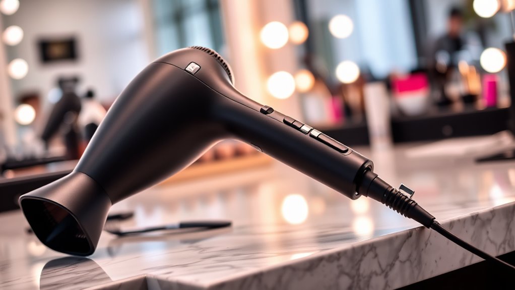 When choosing a professional dryer, I look for safety features like an automatic shut-off to prevent overheating, cool shot buttons to avoid burns, and a sturdy, insulated cord to reduce electrical hazards. I also check for proper airflow vents to prevent overheating and guarantee the dryer has a reliable grounding system. These features give me peace of mind and protect my salon or home from potential accidents.