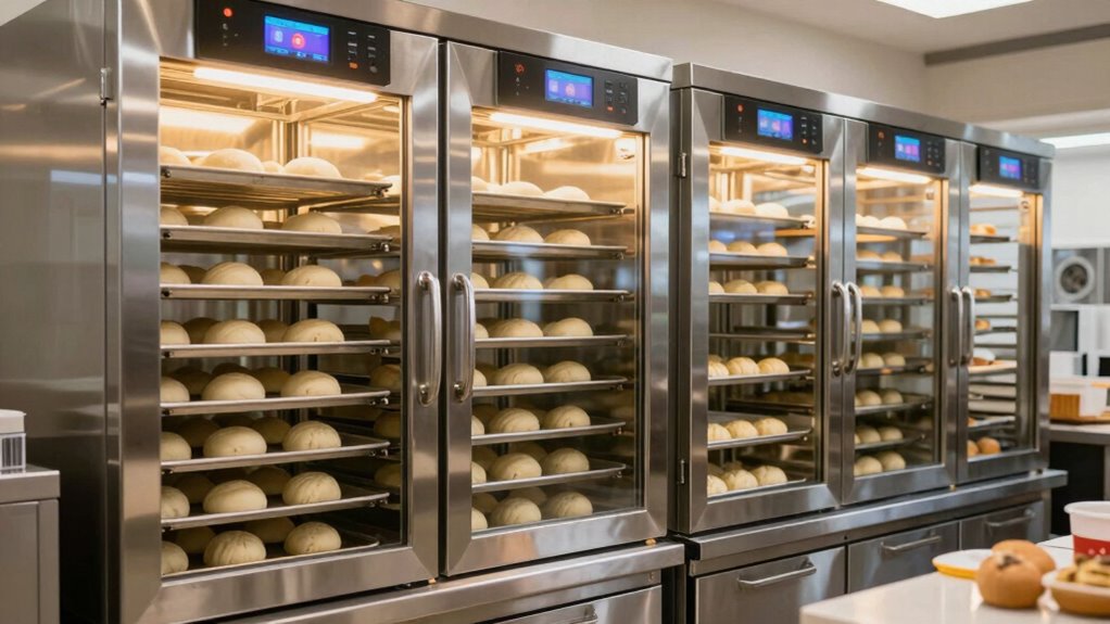 Maintaining the right humidity levels is essential for ensuring a successful proofing process in a small bakery. Precise humidity control, often over 85%, prevents dough from drying out during proofing, resulting in better elasticity and texture. Adjustable humidity settings, typically from 30% to 100%, let me customize conditions based on the baked goods or fermentation stage. Automatic humidity systems help keep moisture levels consistent, which is vital for long fermentation times that develop flavor and improve bread quality. High humidity control also minimizes crust formation and surface dryness, ensuring a superior final product. By selecting a proofing cabinet with reliable humidity features, I can create ideal conditions for my dough, enhancing both the fermentation process and the quality of baked goods.