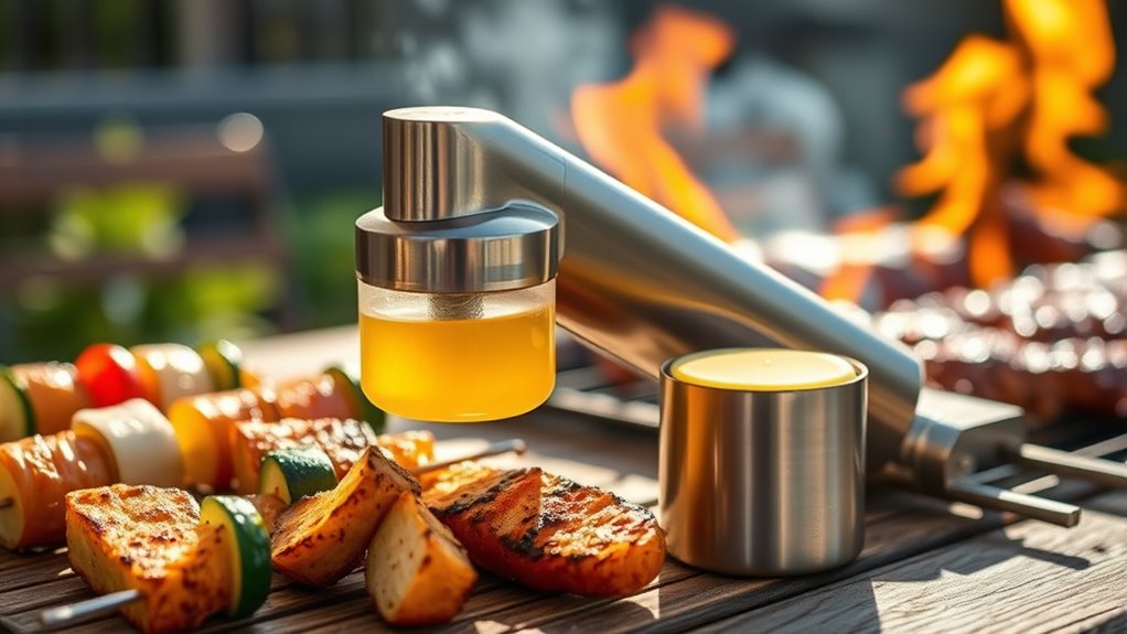 Choosing the right refillable butter sprayer is like finding the perfect seasoning for your grilled masterpiece—making everything better. With options like the GMISUN Oil Sprayer or the Misto Aluminum Set, you’ll enjoy precise, mess-free application every time. Just pick one that fits your grilling style, and watch your barbecue game sizzle to new heights. Trust me, a great sprayer is the secret ingredient to flavorful, perfectly cooked dishes.
