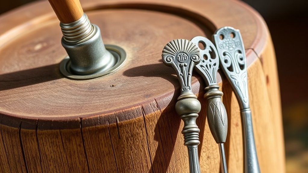Did you know that vintage butter churns date back over 150 years? I found that authentic replacement dashers are surprisingly available through specialty antique stores, online marketplaces like eBay, and vintage farming equipment dealers. I recommend checking out these sources regularly, as authentic parts are often sold by collectors or enthusiasts who value preserving history. This way, you can guarantee your churn stays true to its original craftsmanship.
