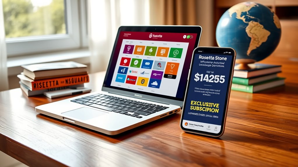 Choosing a Rosetta Stone lifetime subscription means considering the variety of languages and levels it offers, which can considerably enhance your learning experience. A good subscription typically grants access to numerous language courses, from popular options like Spanish and French to less common ones like Swahili or Hindi. This diversity allows me to learn multiple languages at once or switch between them as I progress. Additionally, having access to various levels within each course—from beginner to advanced—provides a exhaustive learning path. The range of available languages and levels adds significant value, especially for polyglots or cultural enthusiasts. With a broad selection, I can tailor my learning journey to my interests and goals, making the most out of my lifetime subscription.