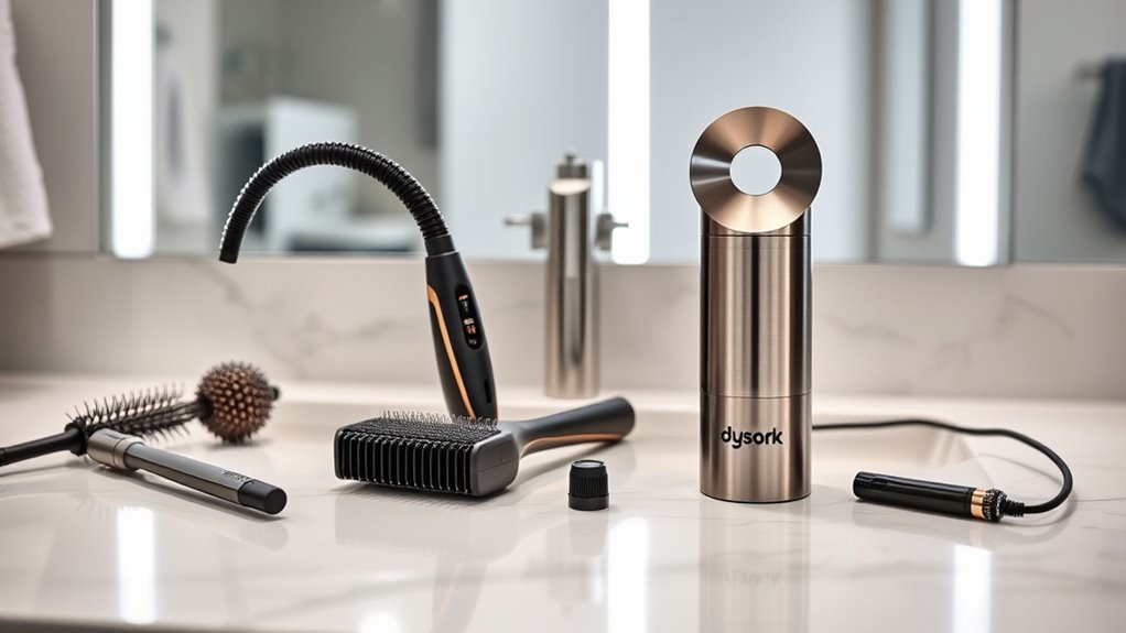 When evaluating the attachment compatibility of the Shark Flexstyle and Dyson Airwrap, it’s *essential* to see if they support your hair types and styling routines. Check if the attachments are interchangeable and easy to swap without tools, as convenience matters. Make sure the accessories align with your desired styles—whether curling, smoothing, or volumizing—and that they’re designed for those techniques. It’s also smart to verify if additional or replacement attachments are available for extended versatility. Additionally, consider how you’ll store the attachments—do they come with a dedicated case or compartments to keep everything organized? Ensuring these aspects match your needs can make a big difference in how seamlessly you incorporate the device into your daily routine.