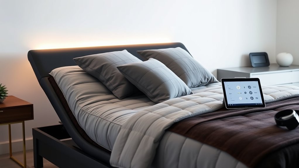 A key aspect of selecting a smart adjustable bed with lumbar support is how easy it is to control. I look for remote controls with intuitive buttons that make adjustments straightforward, especially if I have limited dexterity or tech experience. Backlit buttons are a bonus, allowing me to operate the bed comfortably in low-light settings. Wireless remotes with ergonomic designs and minimal clutter help me avoid confusion and adjust the bed quickly. Preset positions and memory functions are also convenient, letting me save my favorite settings for instant access. Additionally, compatibility with smartphone apps or voice commands can simplify the process further, giving me multiple options to control the bed effortlessly. Overall, ease of remote control is essential for a seamless, personalized experience.