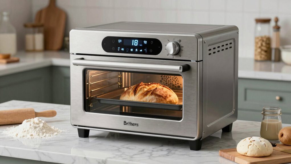 Choosing a smart countertop oven for baking bread means paying close attention to its baking technology features, as these directly impact your results. Advanced baking tech like precise temperature control ensures consistent results, while even heat distribution prevents hot spots and promotes uniform crust formation. Features such as Element iQ or linear T technology monitor and adjust heat in real-time, maintaining ideal baking conditions. Some ovens use smart algorithms that customize preheat and baking cycles based on bread type and thickness, saving time and improving quality. Multi-zone heating allows independent control of top and bottom elements, essential for achieving a crispy crust and soft interior. Built-in sensors and automatic temperature probes help monitor internal bread temperature, automatically adjusting or ending baking for perfect doneness every time.