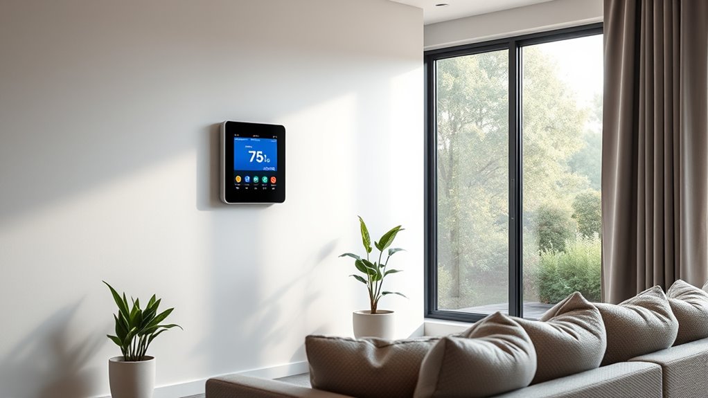 A user-friendly interface plays a key role in maximizing the benefits of smart thermostats with learning features. I look for intuitive navigation, clear icons, and minimal clutter to make operation simple. Touchscreens with responsive controls and customizable displays help me easily adjust settings and manage complex schedules. Large, high-contrast screens improve readability in different lighting, reducing frustration. Voice control and app-based interfaces are game-changers, allowing me to manage the thermostat remotely and hands-free. Consistent layouts and effective feedback, like visual or auditory cues, help me quickly understand the system’s status and make confident adjustments. An intuitive interface guarantees I can effortlessly optimize comfort and efficiency without frustration, making my smart thermostat a seamless part of my home.