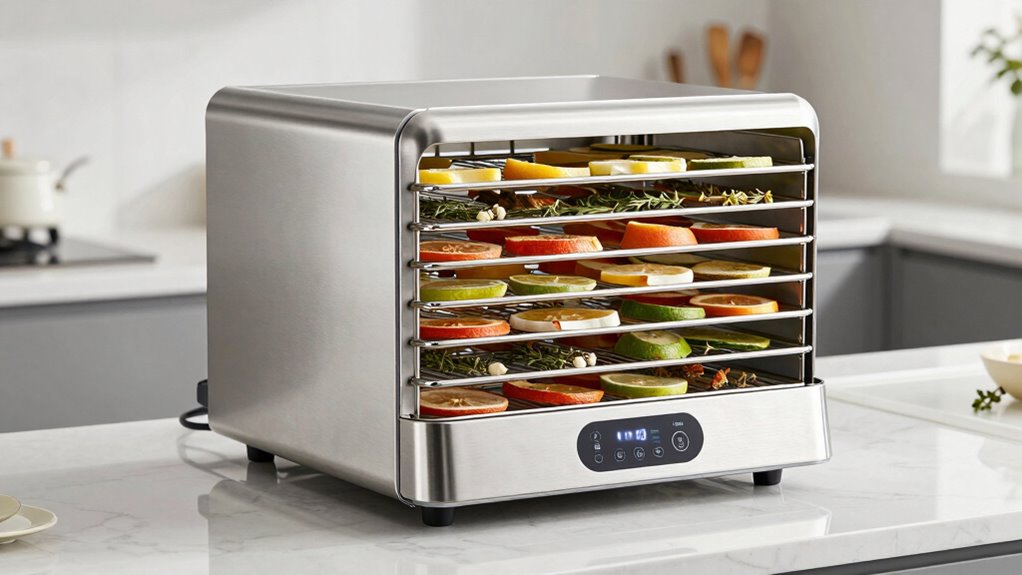 Choosing the right stainless steel food dehydrator is like picking the perfect key to unseal your culinary adventures. With options like large trays and digital controls, you’re equipped to dry everything from jerky to herbs with ease. Trust your instincts and consider what features matter most to you. Once you find that perfect fit, you’ll be on your way to creating flavorful, healthy snacks that last—turning your kitchen into a vibrant food drying oasis.