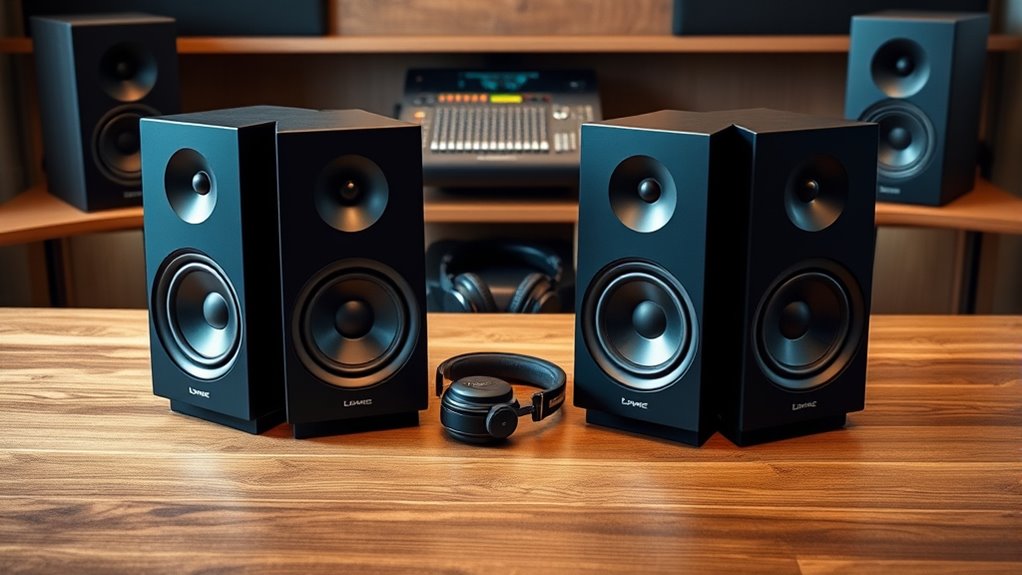 Achieving sound accuracy and clarity is essential when selecting studio monitor speakers, as these qualities guarantee you hear an authentic representation of your audio. Accurate sound reproduction means minimal coloration and distortion, allowing you to trust what you hear. Clarity focuses on delivering detailed high and mid frequencies without muddiness or harshness, which is crucial for precise mixing. A flat frequency response ensures all elements of a track are balanced and natural, helping you identify subtle nuances like instrument separation and spatial positioning. Well-designed drivers and crossovers maintain phase coherence and reduce resonances, contributing to cleaner sound. Ultimately, monitors with high sound accuracy and clarity enable you to make informed decisions during production, ensuring your mixes translate well across various listening environments.